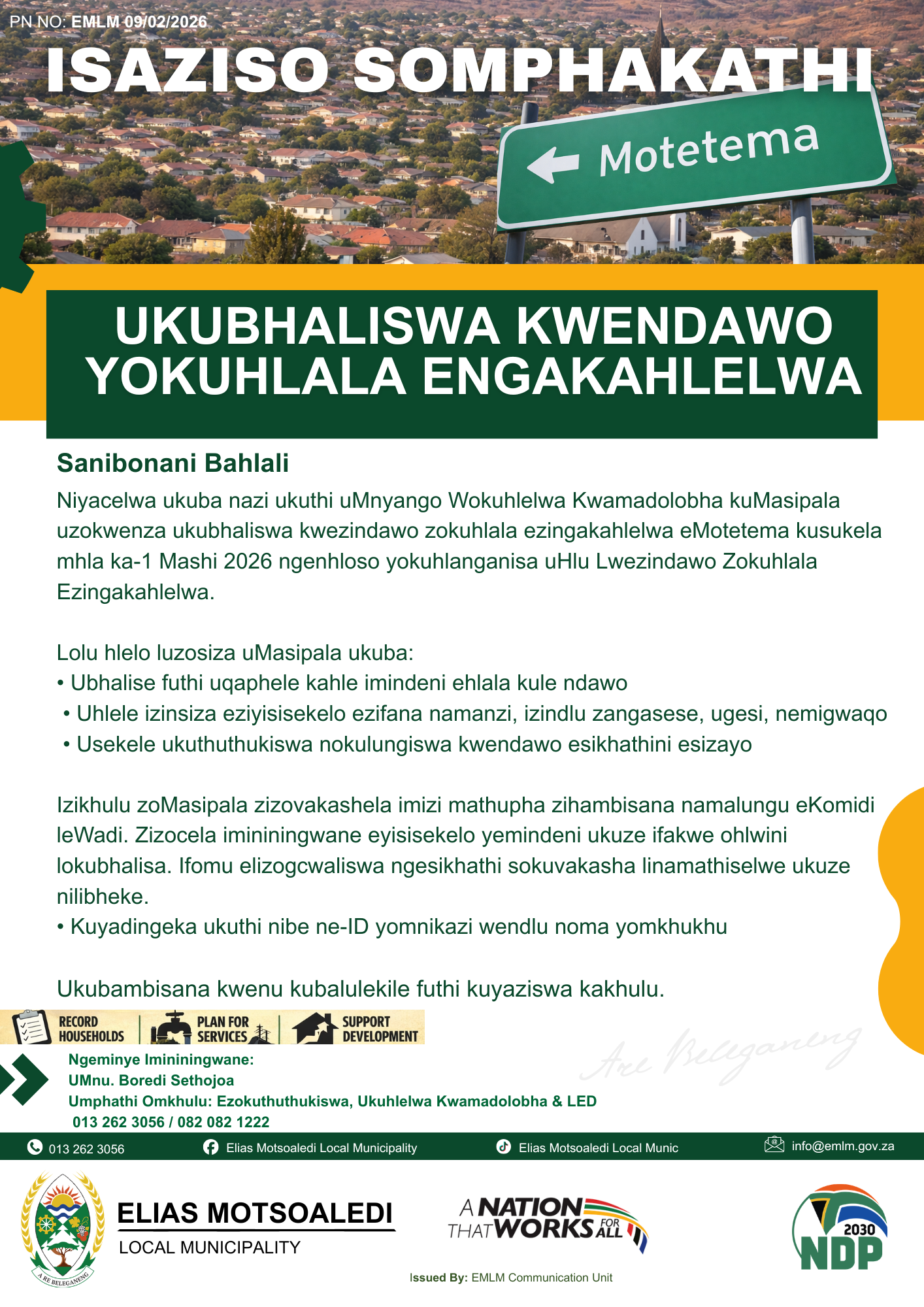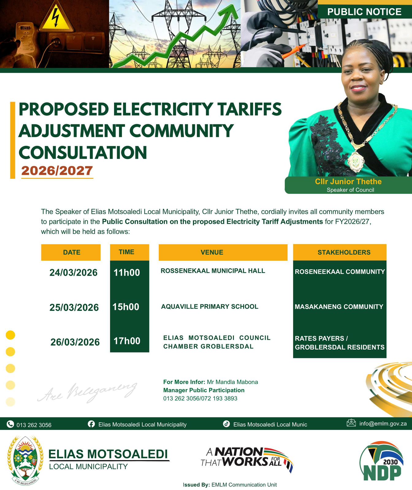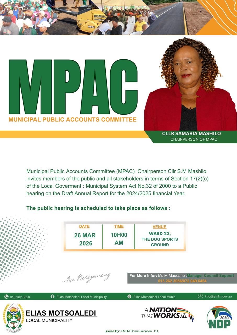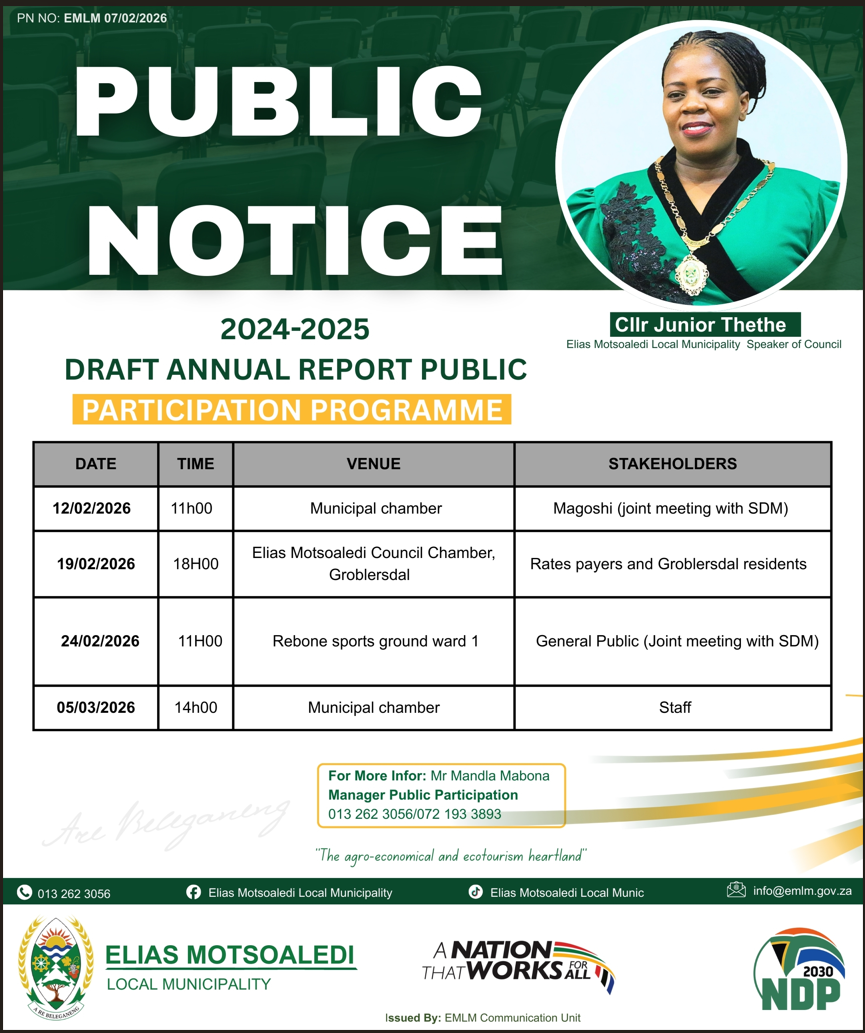 Elias Motsoaledi Local Municipality Mayor Cllr Magetle David Tladi invites all stakeholders, community-based organizations, and community members to the Mayoral Outreach
