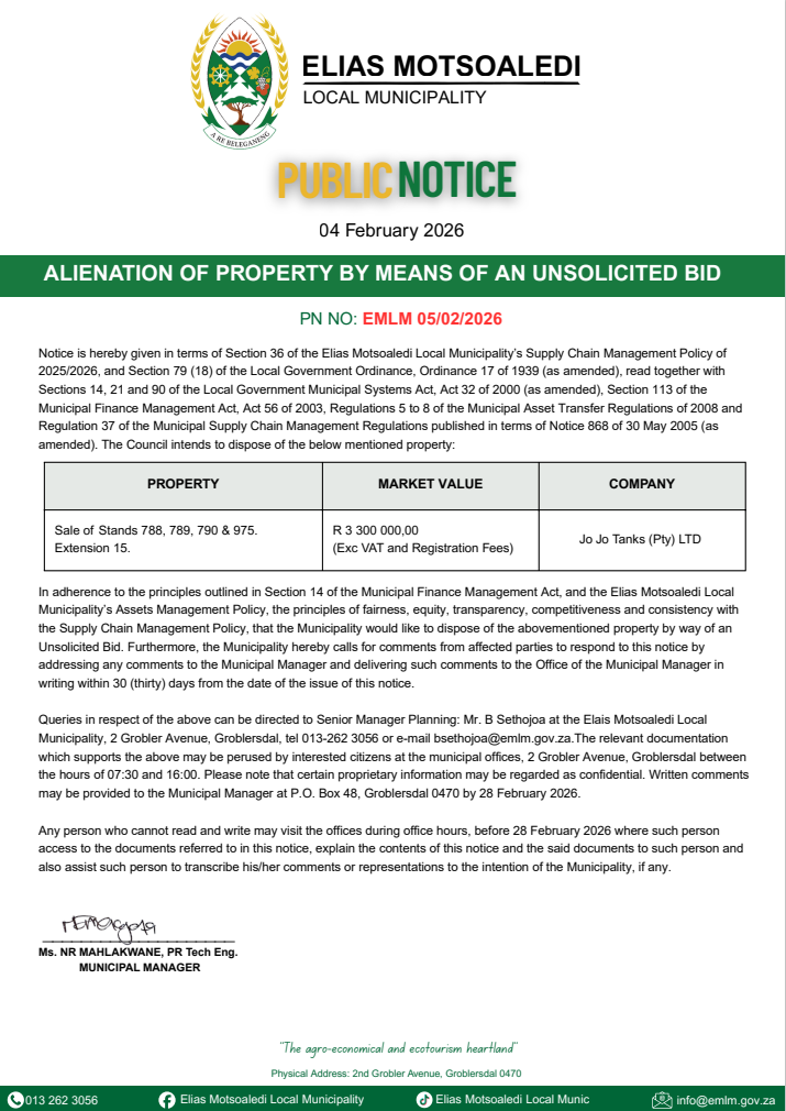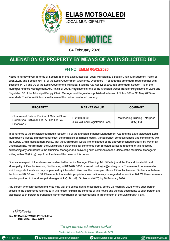 PUBLIC NOTICE NO EMLM 05022026 NOTICE IN TERMS OF THE ALIENATION OF PROPERTY BY MEANS OF AN UNSOLICITED BID