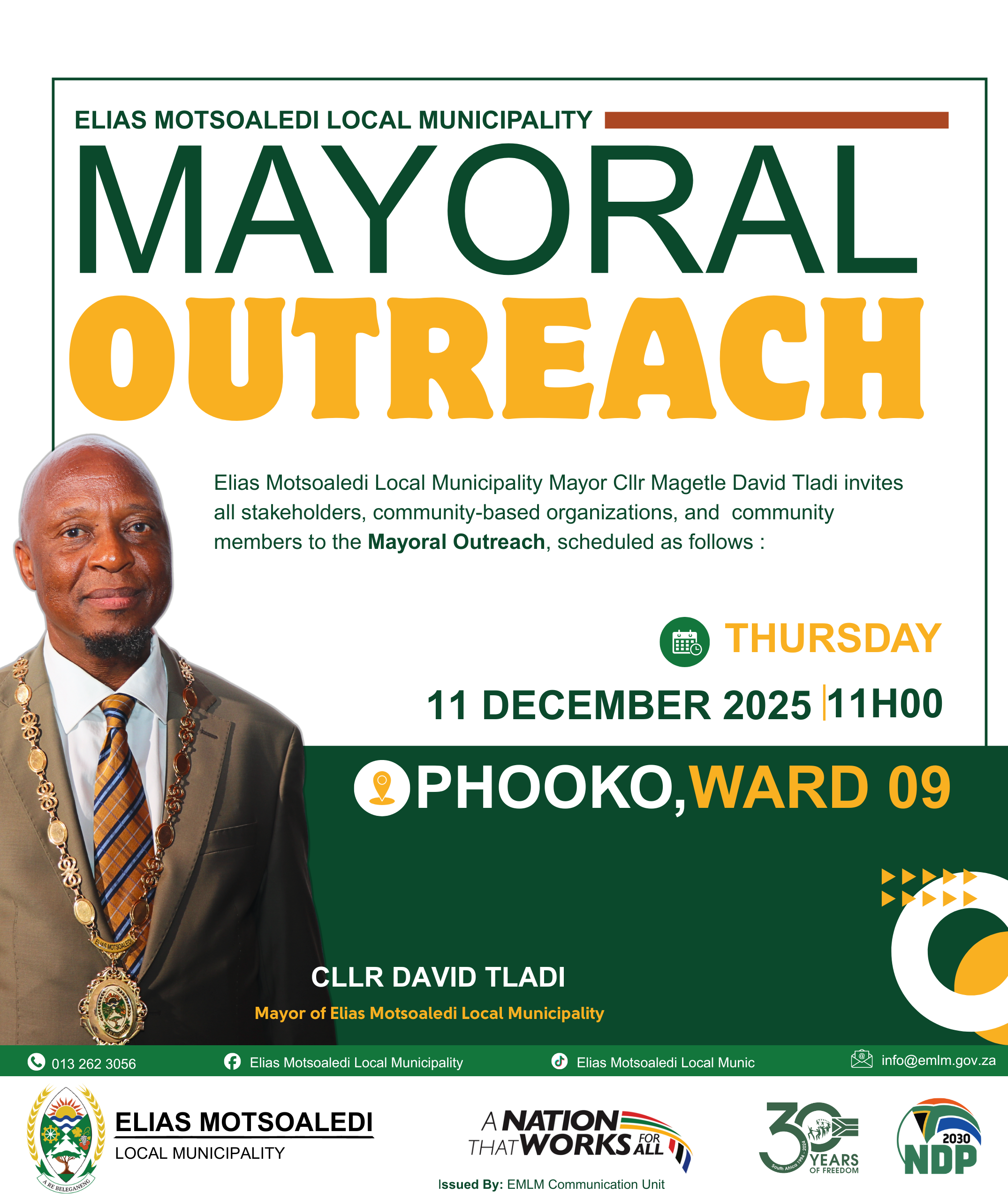 Elias Motsoaledi Local Municipality Mayor Cllr Magetle David Tladi invites all stakeholders, community-based organizations, and community members to the Mayoral Outreach