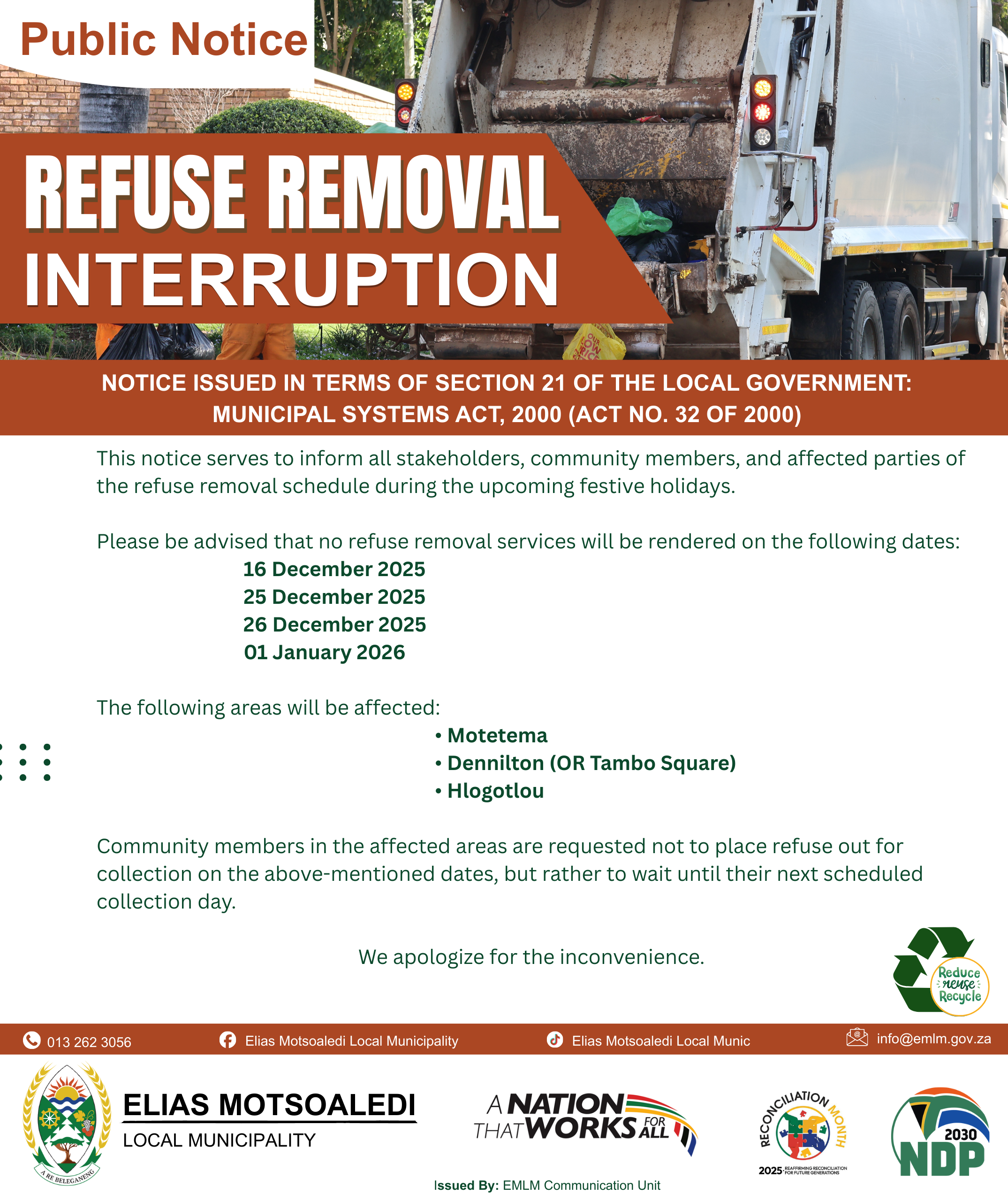Refusal Removal Interruption. This notice serves to inform all stakeholders, community members, and affected parties of the refuse removal schedule during the upcoming festive holidays