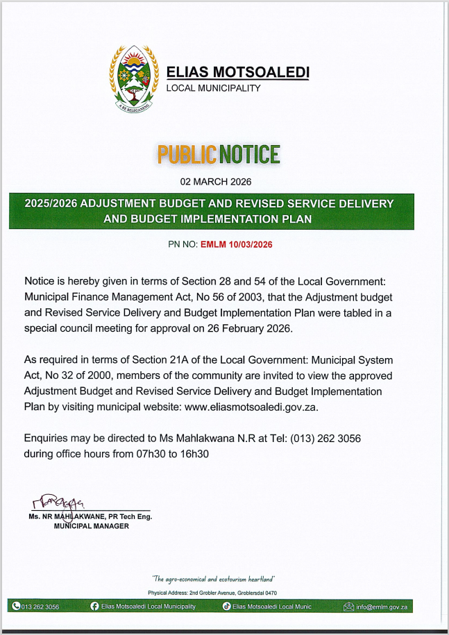 PUBLIC NOTICE 2025 2026 ADJUSTED BUDGET AND SDBIP